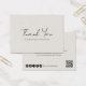 Modern business order insert card featuring a simple and minimalist layout with "Thank You" on the front in an elegant script typography over a neutral beige faux texture background. The back has your business name and title along with your QR code, social media icons and your personal message / discount. This professional order insert card is great for any small business.
