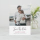 This simple, modern photo wedding save the date flat card has a crisp, fresh minimalist design. The default shape is sharp corners, but rounded corners also work wonderfully with this design, so try both looks in editing mode and see which grabs you! The front features a lively modern Save the Date text in black below your photo and your first names and date and wedding location below that. This 'save the date' script is black and can't be altered. But you can change the colour, size and font of any of the other text on either side. The default text colour for the date and location text on the front is also black, with your names highlighted in an elegant shade of burgundy. On the back the text is dark grey. In addition to editing the design to show your own details, you might choose to remove some text on back, and perhaps replace it with a different type of message of your choice. In any case, please do remember to remove all of our sample details, including the website info on the back side, etc.! The default setting on both sides is a transparent background, so the base colour will simply be the colour of your paper. You can easily change the background colour on one or both sides if you prefer a different look. Use the intuitive design tools and your inspiration to make this simple, modern custom wedding save the date flat card uniquely yours!