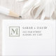 This classic, elegant return address label template features space for the first letter of your last name with a border, both in an elegant medium dark shade of green. The name and address text is a dark grey tone that's mostly black by default. The background is white. This design is fully editable to suit your style. It's perfect for everyday use and also works well with envelopes for wedding thank you cards and other special occasions. You can use two first names, a single first and last name, or any other format. You can also change the background tone to another colour and you can also edit the font, colour and size of the text and also the colour of the border around the initial. We've used a '+' symbol between our sample names, but of course when you edit the design so show your own details, you can change that to another symbol or word if you prefer. Create your own custom look with the intuitive design tools, and please check our return address label collection and get ideas and inspirations from our large selection!
