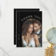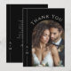 Your wedding guests will be so happy to receive this beautifully elegant wedding thank you card in black featuring a special photo from your wedding day. Simple, elegant and tasteful, this classic design features a thin line border along the left edge with the bride and groom's monogram initial. Lovely serif lettering spells out Thank You in curved text above the arch photo template. Replace the sample photo with your selected photo. The back of the card has a text template with a sample thank you message that you can use as written, or personalise with your own wording, along with the bride and groom's names.