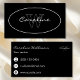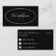 A business card in a simple and elegant design in white on black with a name and monogram in an oval on the front and contact information on the back.