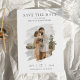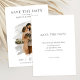 Simple wedding save the date with photo in watercolor brush stroke frame and elegant modern typography.