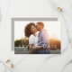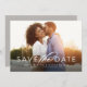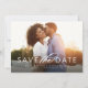A simple but elegant save the date card to announce your engagement and upcoming wedding. The single horizontal photo features white text at the bottom with plenty of room for names and big day details. The back is a soft grey with a subtle stripe pattern. The colour can be changed by clicking "customise further."
