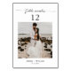This wedding table number design features a simple and elegant layout with a decorative script at the top, a bold table number in the centre, and a romantic couple’s photo as the focal point. The clean white background and minimal text at the bottom create a refined, modern, and personalised look.