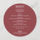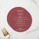 A round dinner menu card on terra rosa (or any colour) and chic lettering in white displays your menu choices. Perfect for a modern wedding reception, wedding rehearsal dinner, anniversary party or any special event with a sit down dinner. Choose ANY COLOR BACKGROUND, any COLOR TEXT, any FONT! Easily personalise with your dinner menu and details.