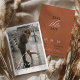 This elegant and simple terracotta / burnt orange, black, and white modern wedding save the date with a beloved Christian "We Love, because He first loved us - 1 John 4:19" bible verse over your favourite engagement photo on the front and elegant minimalist save the date wedding details and design on the back including your wedding website in white over a solid terracotta colour background is the perfect way to announce your big day! Easily personalise the text and upload your photo to make it uniquely yours. You may even edit / adjust placement of design components further, by clicking the blue "Edit using design tool" button at the bottom of the "Personalise This Template" window, then navigate to the "layers" tab in the left hand column of the edit screen, select the front or back side layer, then click on the element you would like to change with the toolbox on the right, and click the "done" button when finished ♥ Custom design and/or colour requests and template questions are always welcome - click the "message" button or email: figandlilyco@gmail.com. Design is lovingly created by Fig and Lily Studios - sending blessings and thanks for being here with us! (Photo credit of our beautiful daughter's engagement/wedding: @laurenmargaretphotography)