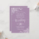 This beautiful wedding invitation features a simple yet elegant design with lacy script calligraphy on a lilac, lavender, or dusty purple colored background and frilly white floral lace filigree in the corners. The colors are perfect for a winter ceremony.