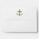 Simple watercolor eucalyptus leaves with gold colour cross envelope for Christian baptism invitations or religious occasions.