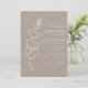 This simple, elegant wedding invitation features a graceful white line drawing of a eucalyptus sprig. Customise the white text with the first names of the bride and groom in serif font and the remaining text in sans serif and handwriting script on a taupe background. The back of the card is solid taupe.