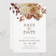 This elegant save-the-date card features hand-painted watercolor burnt orange and terracotta leaves, and cream and beige dahlias arranged as a beautiful bouquet. Find matching items in the Autumn Romance Collections.