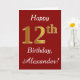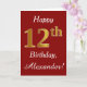 This simple birthday card design features the message "Happy 12th Birthday", with the "12th" having a faux gold-like appearance. It also features a customised name, and a dark red background. It could be given to somebody who is celebrating their twelfth birthday.