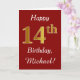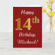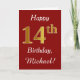 This simple birthday card design features the message "Happy 14th Birthday", with the "14th" having a faux gold-like appearance. It also features a personalised name, and a dark red background. It could be given to somebody who is celebrating their fourteenth birthday.