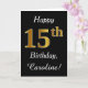This simple birthday card design features the message "Happy 15th Birthday", with the "15th" having a faux gold-like appearance. It also features a custom name, and a black background. It could be given to somebody who is celebrating their fifteenth birthday.