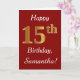 This simple birthday card design features the message "Happy 15th Birthday", with the "15th" having a faux gold-like appearance. It also features a custom name, and a dark red background. It could be given to somebody who is celebrating their fifteenth birthday.