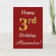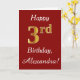 This simple birthday card design features the message "Happy 3rd Birthday", with the "3rd" having a faux gold-like appearance. It also features a custom name, and a dark red background. It could be given to somebody who is celebrating their third birthday.