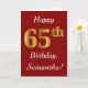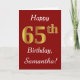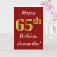 This simple birthday card design features the message "Happy 65th Birthday", with the "65th" having a faux gold-like appearance. It also features a personalised name, and a dark red background. It could be given to somebody who is celebrating their sixty fifth birthday.