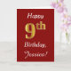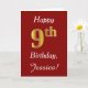 This simple birthday card design features the message "Happy 9th Birthday", with the "9th" having a faux gold-like appearance. It also features a custom name, and a dark red background. It could be given to somebody who is celebrating their ninth birthday.