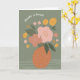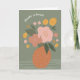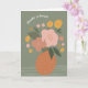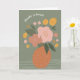 This folded thank you greeting card features an abstract and modern illustration of pink and yellow flowers in a terracotta vase on a sage green background. The front reads simply "thanks a bunch" and the inside is blank for versatility.