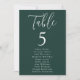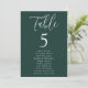 Modern wedding seating chart featuring "Table" displayed in a white script with the table number and guest names shown below on a forest green background. The design repeats on the back. To order the table number seating chart, edit each card with the table number and guest names and add it to your cart. Designed to coordinate with our Simple Script wedding collection.