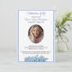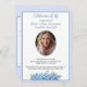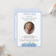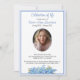 The invite features an oval shaped portrait photo with elegant simple border of a sage green line. Blue small pretty flowers symbolises everlasting love and remembrance.