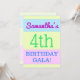 This colourful birthday party invitation design features a message like "Samantha’s 4th BIRTHDAY GALA!", where the name and birthday number can be personalised. It also features a colourful, fun, geometric-themed background. The event details on the back can be customised. It could be used to invite people to somebody’s fourth birthday celebration or birthday party. [~Z0000311]