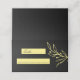 Unique simple wedding folded place card featuring romantic and elegant gold flowers on black background