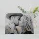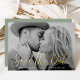 Simple save the date card featuring your full-bleed horizontal photo with "Save the Date" displayed in a gold foil script. Personalise the minimalist save the date card with your name, wedding date, and wedding location. The card reverses to a solid sage green background.