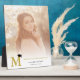 This classic and simple gold and black graduation photo display plaque design features a bold monogram letter 'M' of the graduate with a black mortarboard / graduation cap as an accent on a gradient white photo overly.