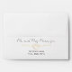 Simple, elegant, minimalist, white 5x7 envelope for wedding invitations with return address, modern calligraphy script and gold rope heart.