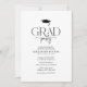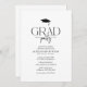 Simple graduation party invitation. Design features a classic white background, a motarboard, unique typography 'GRAD party' and an elegant party template that is easy to customise.