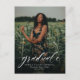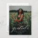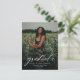 Celebrate your grad and invite guests with this vertical one-photo graduation announcement postcard that features an modern and trendy calligraphy script grad on the front and a customizable back for your party details.