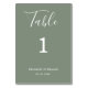 Modern green sage background with white script with the word "table" written in it appears on fashionable wedding table number cards. A taupe background or any colour of your choosing is used in the design. The pattern is repeated on the back. Include your name, wedding date, and table number when ordering the table cards. Individually add each number to your cart, then proceed to the checkout when done.