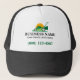 This black and white trucker hat features a simple yet effective design that promotes your lawn care and landscaping business. The green lawnmower graphic stands out against the clean white background, while the black mesh back provides comfort and breathability. The inclusion of your business name and contact information makes it a great way to promote your services on the go. Stand out from the crowd while showing off your business expertise with this practical and stylish headwear. It's perfect for daily use, and a wonderful tool for advertising your business.