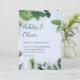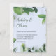 The invitation's light blue colour scheme complements the greenery on the border perfectly. The majority of the text is in a stylish dark grey, giving the invitation a sophisticated and elegant look. The couple's names are highlighted in a dark green, which matches the greenery on the border, adding a personalised touch to the invitation.