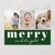 Simple modern Christmas holiday postcard featuring three photo collage and Holiday greetings in white on dark pine green background: Merry and bright, in a mix of classic typography and chic modern handwritten script. The reverse of the card contains your custom Christmas message with your last name and year. Customise this unique minimalist template by clicking on the ´´Personalise´´ button.