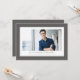 This simple and sophisticated graduation announcement features one horizontal photo on the front surrounded by a slate grey frame with a herringbone tweed effect. The fabric look (please note it's not real fabric) gives this design - which doubles as a graduation invitation too - a classic academic style and the simple type is the perfect personalised touch. The back of the card is a matching grey pattern with room for a second photo and graduation party invitation text. The text and photo can also be left blank. This original grad card by Lea Delaveris Design is also available as a digital graduation announcement and invitation download and can be found in a variety of colours in the herringbone tweed grad collection. Coordinating graduation supplies also available!