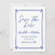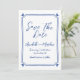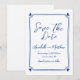 Simple Hand Drawn Whimsical Blue Wedding Save the Date. This European Inspired Blue and White Save the Date Card features a clean, minimalist design perfect for couples seeking timeless elegance. A subtle hand drawn frame with charming blue hearts in each corner gently encircles your wedding details, presented in a mix of script and handwritten style fonts for a look that feels both stylish and personal.
