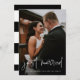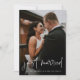 Just Married! Announce your wedding to family and friends with this simple and modern photo flat card. It features a white handwritten script overlay with black and white stripes. Personalise by adding names, date, venue and a photo.