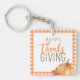 This simple Thanksgiving keychain features a watercolor pumpkin and fall leaf foliage with an orange plaid pattern border.