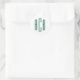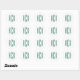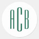 Modern three letter monogram design in hunter green on solid white round stickers.