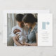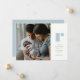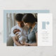 A simple introduction for your new little one featuring a single photo, a blue large initial, room for stats and parents' names along with a dotted coordinating backer. Want a different colour? Click "customise" to adjust.
