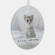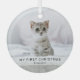Create a pet's first christmas ornament with this simple modern template. Design features a photo of your puppy or kitten, a white overlay banner with the text 'MY FIRST CHRISTMAS' and the pet's name.