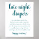 Fun way to give new parents advice and laughs with this vertical late night diapers well wishes table sign: Simple shower or gender reveal party flourish calligraphy sign featuring a fun, casual hand-lettered script. The classic design includes a modern handlettered quote typography overlay with poem. For other colors or matching products, please visit the JustFharryn Zazzle store, or contact the designer, c/o Fharryn@yahoo.com All rights reserved. #bohochic #zazzlemade