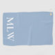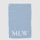 Three white letters are near the bottom. You can change the letters to display the correct monogram. This monogrammed golf towel is baby blue.