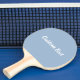 This light blue ping pong paddle has text in a white script. The text can be edited or deleted.