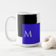 Bold and colourful yet simple in its minimal colour block design, this stylish mug has a bright cobalt blue, black and white colour block pattern with your monogram initial in white text. It makes a great gift or addition to your mug collection. Personalise with your desired initial.