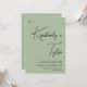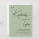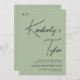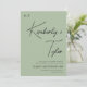 Calligraphy signature script bride and groom names wedding invitation with couple monogram initials on a simple sage green (changeable colour) background - suitable for modern contemporary style weddings, spring and summer outdoor garden formal or casual ceremonies, and receptions.