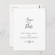 This simple minimalist save the date postcard is perfect for a modern wedding. The simple and elegant design features classic and fancy script typography in black and white.