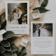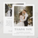 A simple, modern wedding thank you card featuring a custom vertical photo on the front and a horizontal photo on the reverse. The words "Thank You" appear in classic charcoal grey serif font. Add your names and the date and location of the wedding below. Personalise the reverse side with a message of your choice. Easily replace the sample images with your own wedding photos.