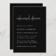 These elegant, dark black and white wedding rehearsal dinner invitations are simple and minimalist yet very stylish due to the modern handwritten script and clean layout.